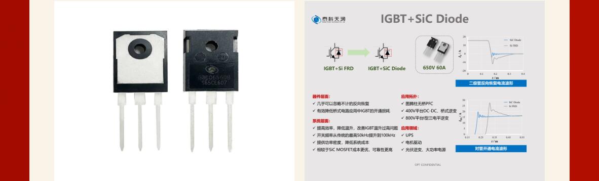 650V混合单管(Si IGBT + SiC diode)可大幅降低IGBT的开关损耗,提高效率,降低温升。