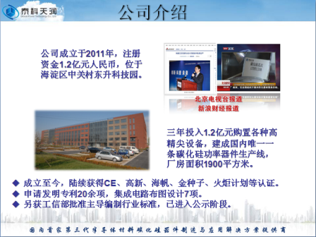 公司曾荣获“国家火炬计划产业化示范单位”、“半导体创新与技术奖”等奖项,承接来自北京市科委的碳化硅项目以及国家科技部“战略性先进电子材料”十三五重点专项。紧密保持同国内外顶尖科研院所的合作,力求为下游提供高质量的产品,在车用电子、机车牵引、光伏发电、消费电器等各领域得到了客户的认可。