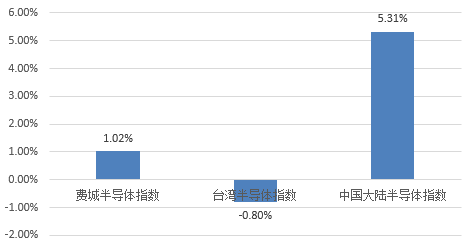上周,费城半导体指数上升1.02%,高于纳斯达克指数1.81个百分点;台湾半导体指数下降0.8%,与台湾资讯科技指数持平。中国大陆半导体发展指数上涨5.31%,高于A股指数3.54个百分点。上周中国大陆半导体发展指数中,有57家公司上涨,8家公司下跌。其中,涨幅比较大的公司有长川科技(+24.40%)、深科技(+19.08%)、歌尔股份(+17.52%)等。
