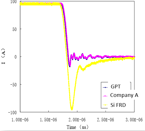 但碳化硅二极管相比于硅材质的快恢复二极管拥有更优秀的反向恢复时间,(快恢复二极管一般反向恢复时间为50ns左右;碳化硅二极管反向恢复时间一般在10ns以内)与极少的反向恢复电流,这能大大降低MOSFET和二极管开关过程中产生的损耗。根据能量守能,能量不会凭空的产生或消失,损耗的能量大部分都以热能的形式散失,这会使系统温度升高。