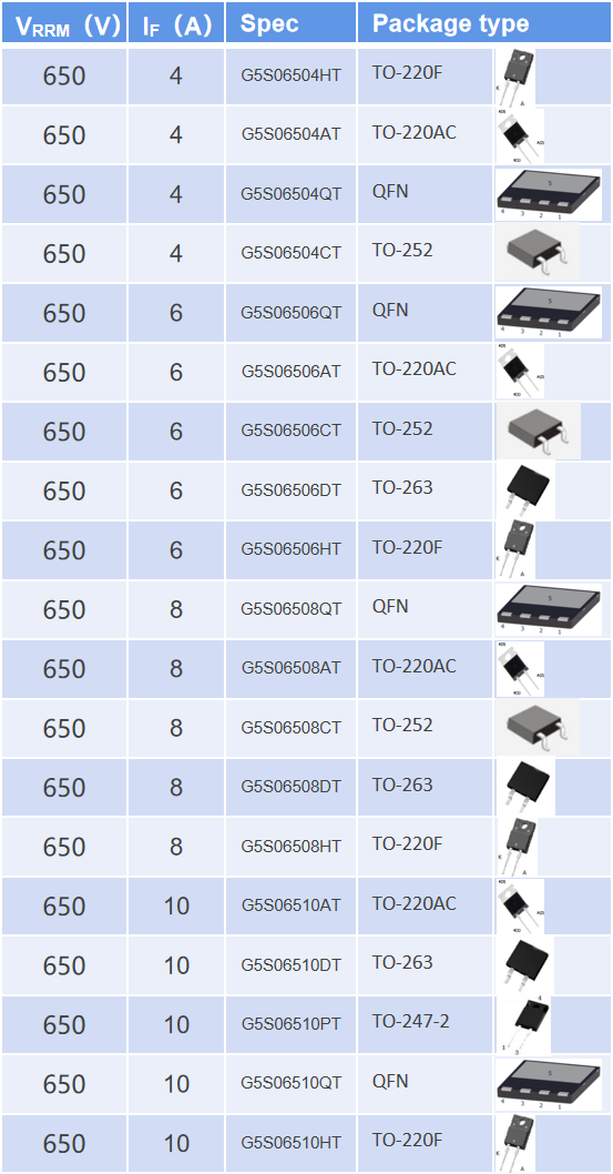 OBC的前级PFC电路和后级DC/DC输出电路中,建议使用SiC二极管。G5S06510DT已批量应用于3.3kWobc中。