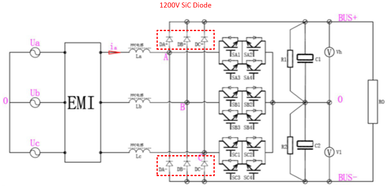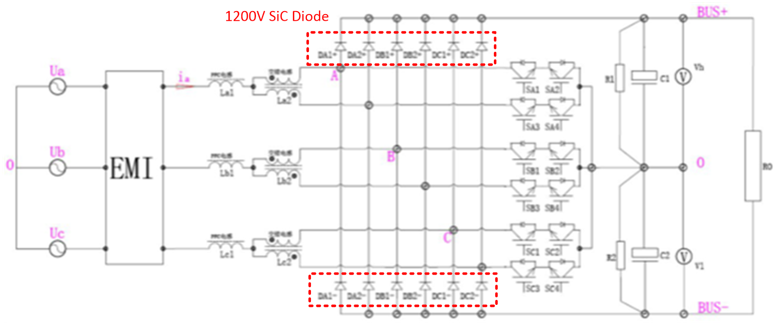 从经济角度来看,全SiC 的VIENNA PFC方案,成本仍较高,现阶段不是一个合理的选择;传统前级PFC方案中由于1200V Si的快恢复二极管特性较差,可以考虑用反向恢复特性更好的SiC二极管替换,与Si MOSFET配合使用,可同时降低高频二极管与Si MOSFET的温升,提升VIENNA PFC的性能;