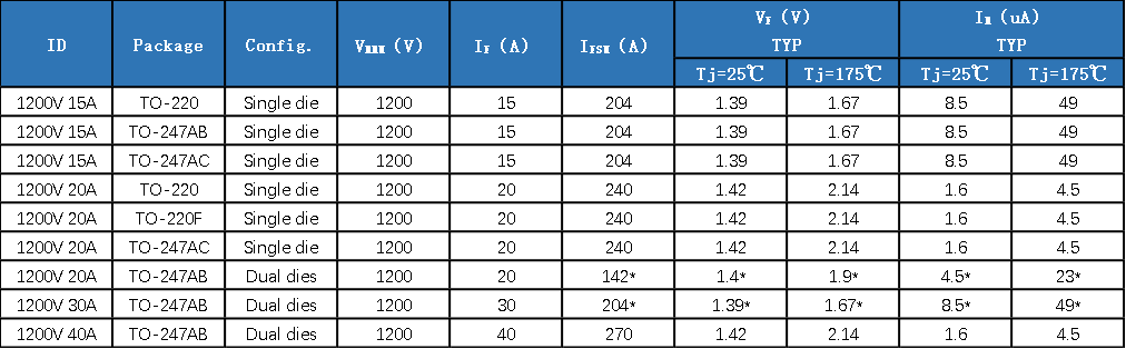 304AM永利面对充电模块等客户对于效率性能、运维成本、功率密度等多方面的需求,基于现行的各种拓扑,量产了1200V多种封装形式的SiC二极管系列产品,见表1。针对其他应用也有1200V2A/3A/5A/8A/10A/50A TO252/TO263/TO220AC/TO247等电流产品对应。